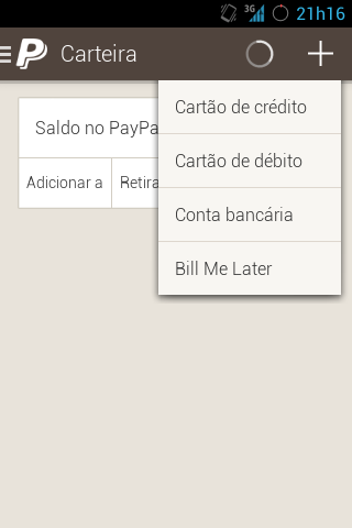 Na guia comprar, o app vai mostrar o locais onde é possível pagar com o PayPal, infelizmente aqui no Brasil não a muitos estabelecimentos que aceitam, pois os brasileiros começaram a usar o serviço a pouco tempo, é muito comum você ver em lojas virtuais o possibilidade de pagar com o serviço, como exemplo o PagSeguro e o Walmart. Na guia carteira, você tem acesso ao saldo líquido na sua conta, ou seja, o que você tem, atualmente eu uso o serviço para receber o pagamento do Adf.ly e até agora não tive nenhum problema, nesta guia você também pode usar para vincular seus cartões de crédito e débito a sua conta, também da para adicionar a sua conta bancária. Já na guia atividade é possível ver o histórico de pagamentos enviados e recebidos, exibe também dados sobre transferências recebidas ou enviadas.